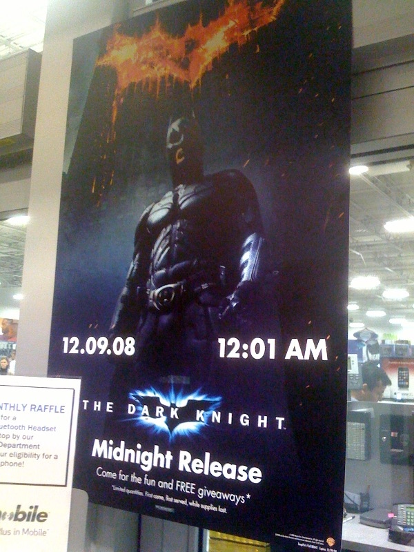 I was at the downtown San Francisco Best Buy yesterday when I noticed this signage when I walked in the door. Apparently some of the Best Buy stores are doing Midnight launches on Monday night for The Dark Knight DVD/Blu-ray. Apparently some Circuit City, Blockbuster Videos and Virgin Megastores will also be open at midnight for the home video release launch. I don’t believe I’ve ever seen a midnight launch for a movie before (I’m sure someone in the comments might prove me wrong), which is pretty incredible.
